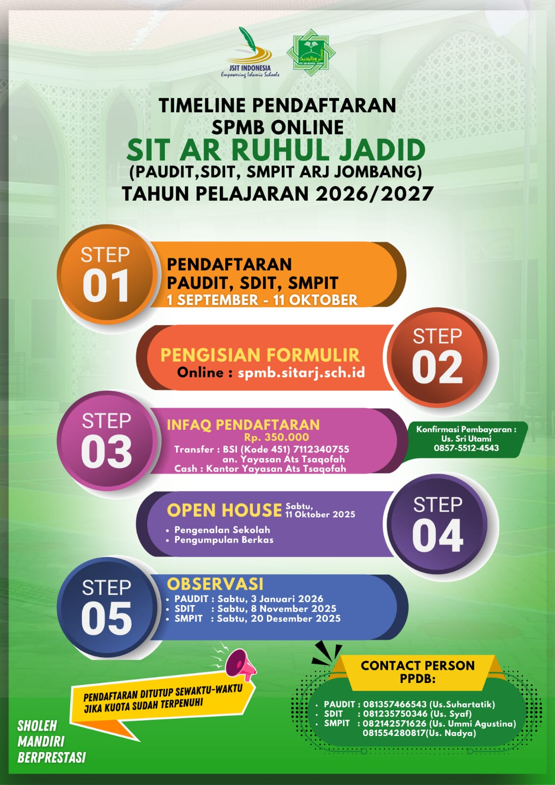 SIT AR RUHUL JADID menyediakan SPMB secara online diharapkan proses SPMB dapat berjalan cepat dan bisa dilakukan dimanapun dan kapanpun selama sesi SPMB SIT ARJ dibuka. Proses pendaftaran calon siswa baru dapat dilakukan secara online apabila terhambat oleh jarak jika datang ke lokasi, bisa melakukan pendaftaran peserta didik baru dengan cara mengakses SPMB Online SIT AR RUHUL JADID.